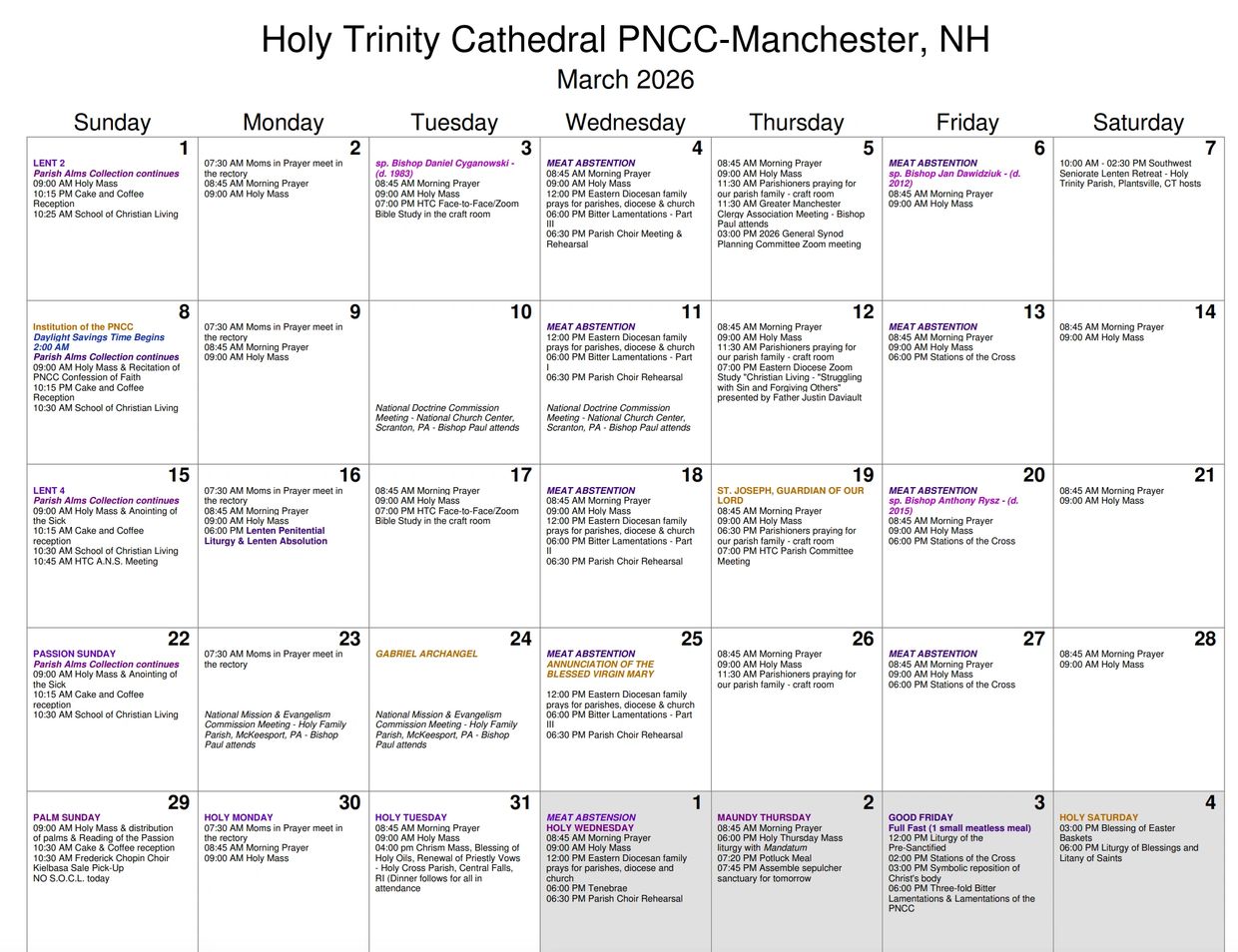 HTC March 2026 Parochial Calendar (pdf)